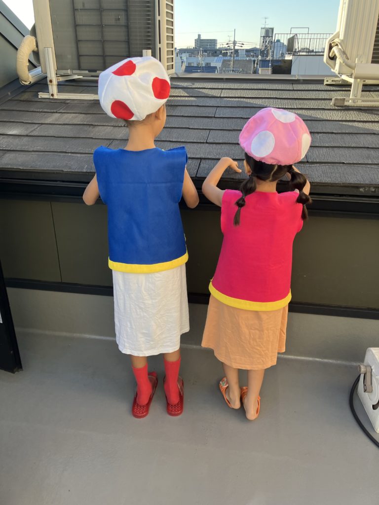 写真は夫婦で夜な夜な作った娘たちキノピオベストの仮装です〜